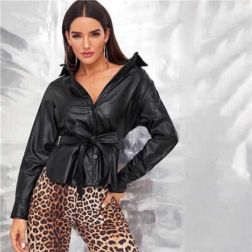 SHEIN Black Single Breasted Belted Faux Leather Jacket Coat Women Autumn Spring Split hem Solid Casual Motor Storm PU Jackets